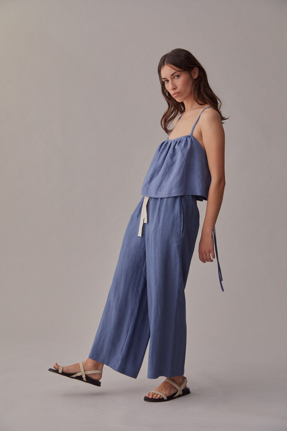 Mid waisted cropped pant with loose fluid leg.